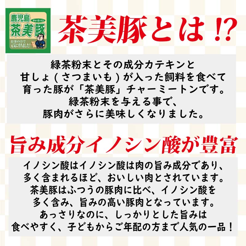 お茶の力で元気に育った、鹿児島県産 茶美豚(チャーミートン)