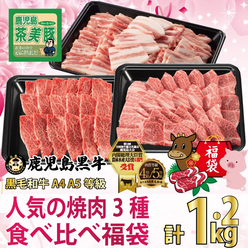 鹿児島黒牛 黒毛和牛 A4 A5等級・鹿児島県産茶美豚・人気の焼肉3種食べ比べ福袋(ロース・カルビ・バラ)